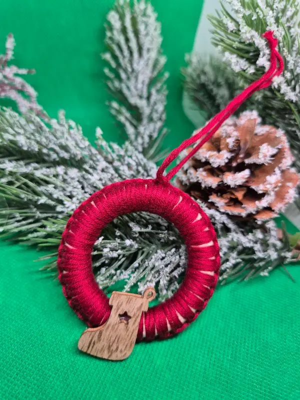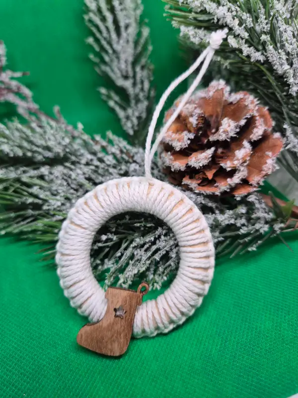 Fonallal bevont, makramé technikával készített, 38 mm-es három választható színű fonallal bevont teljes egészében vagy félig makramézott fa fenyődísz csizma díszítéssel. A fonalszín választható: piros, bordó és fehér színben, 6 darabos csomagban.