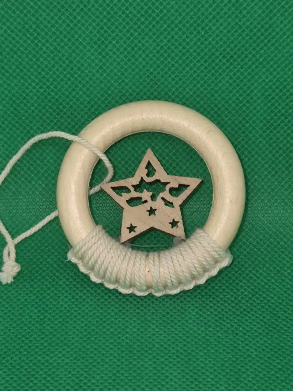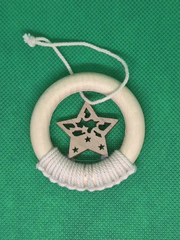 Fonallal bevont, makramé technikával készített, 38 mm-es fehér fonallal bevont félig makramézott fa fenyődísz csillagos díszítéssel.