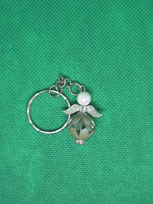 Gyöngyből készült fordított szoknyás angyalka kulcstartó, gömb formát öntve.