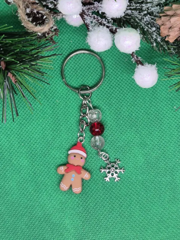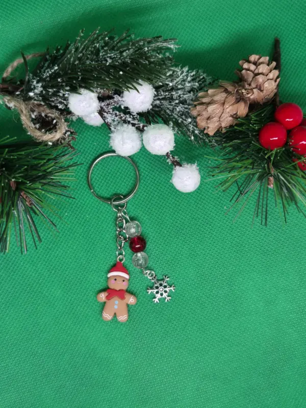 Mézi figurás kulcstartó melyet hópehely és hópelyhes gyöngyök és roppantott üveggyöngy díszít.