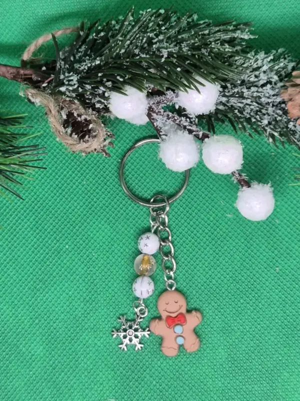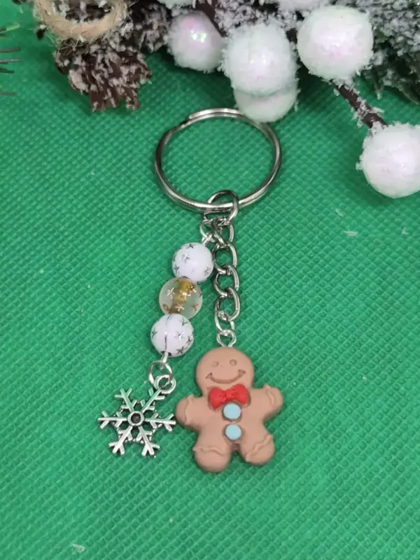 Mosolygós mézi figurás kulcstartó melyet hópehely és hópelyhes gyöngyök díszítenek.
