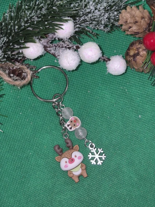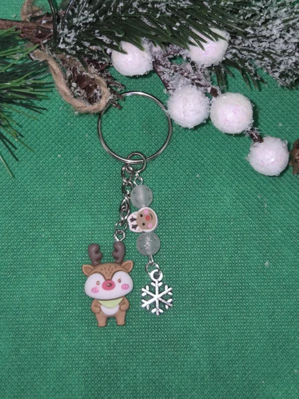 A zöld sálas rénszarvas figura gyantából készült. Mellette hópelyhes gyöngy hópehellyel. Kétféle méretben kapható a rénszarvas: 2,7 cm és 2 cm. A kulcstartó teljes mérete: 8 cm.